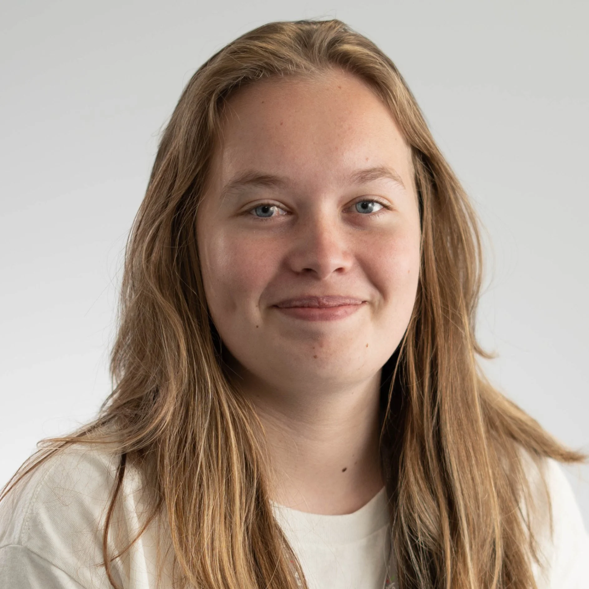 • Portrait of a person with long hair smiling slightly, wearing a light-colored shirt.